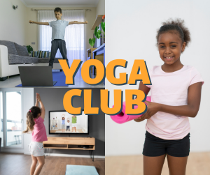 Kids doing yoga at home with text yoga club